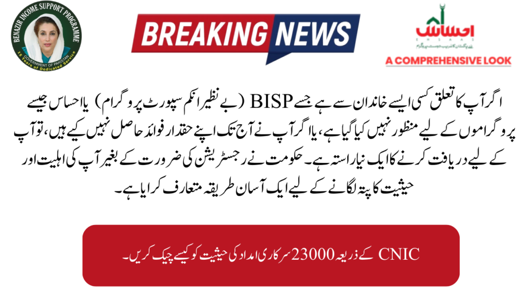 - Check Eligibility: Submit your CNIC number to verify your eligibility and current status regarding government assistance programs.